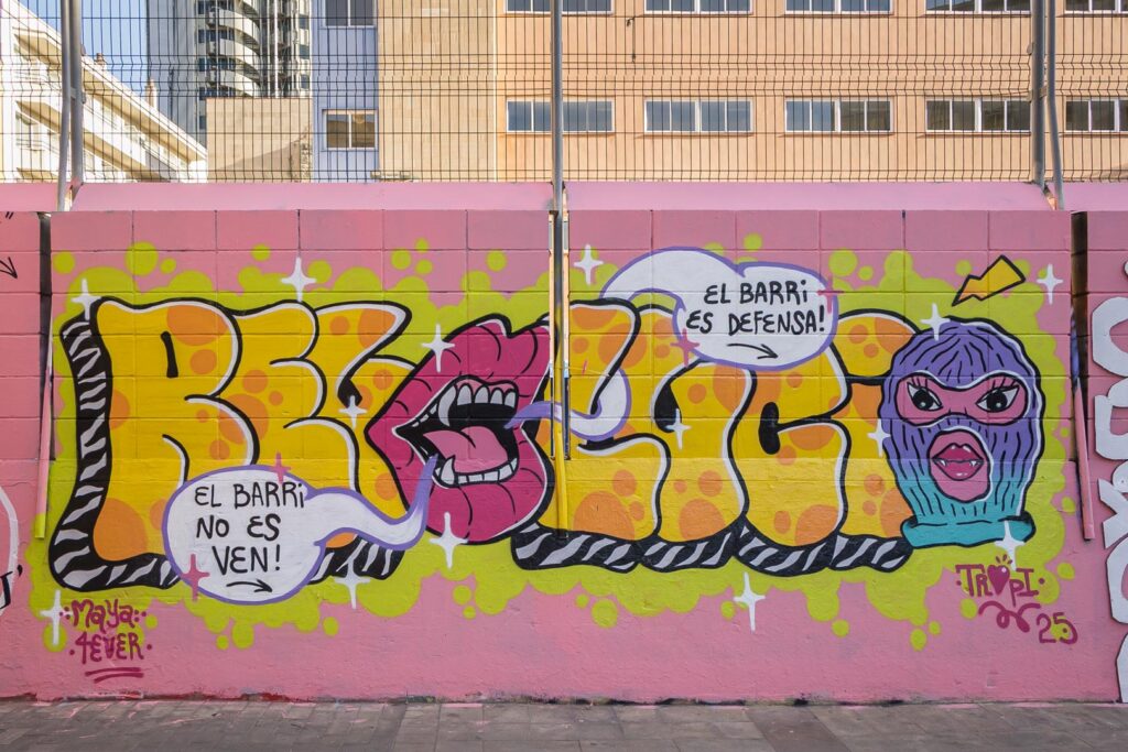 Murals en la façana exterior de la pista drassanes en el carrer Arc del Teatre amb Carrer Est.