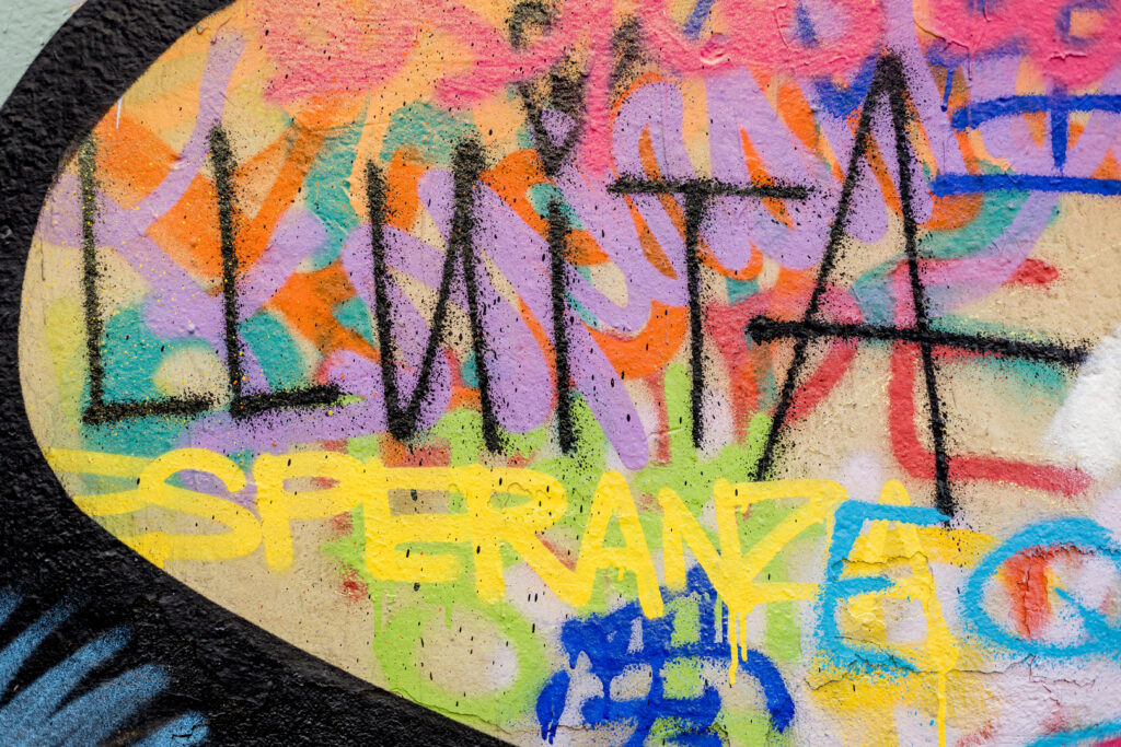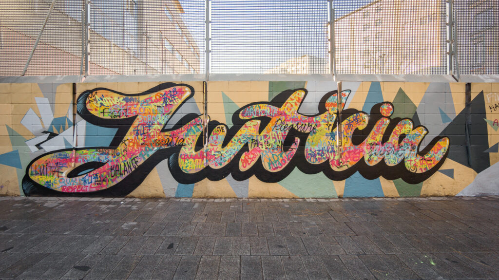 Turkesa va oferir un taller de cal·ligrafia als estudiants de primer de batxillerat artístic on es va fer una selecció de paraules que decoren el mur exterior de la pista de Drassanes.